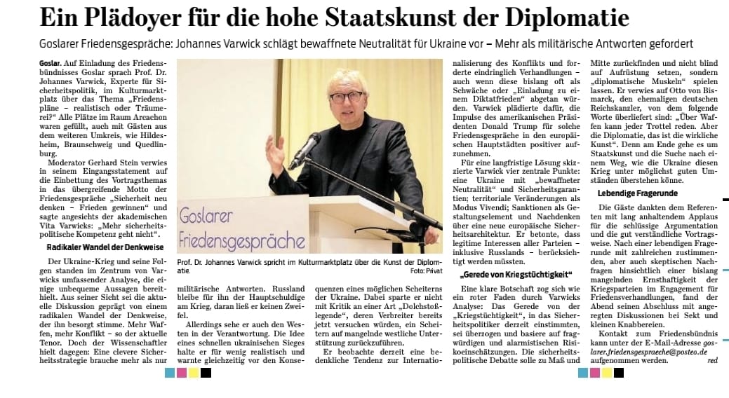 • An der Universität Halle habe ich mit Botschafter a.D. R. Lüdeking und Oberst a.D. W. Richter über Genese, Bewertung der militärischen Lage und politische Lösungsansätze im Krieg gegen die Ukraine diskutiert. Eine spannende zweistündige Debatte, die die wichtigsten Gegenpunkte zur Mainstreamdebatte gut akzentuiert. Hier als Video zum Nachhören (29.6.2024).