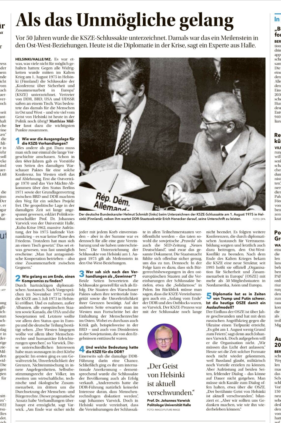 - Mit der Mittdeutschen Zeitung habe ich über 50 Jahre KSZE-Schlussakte von Helsinki gesprochen (01.08.2025).