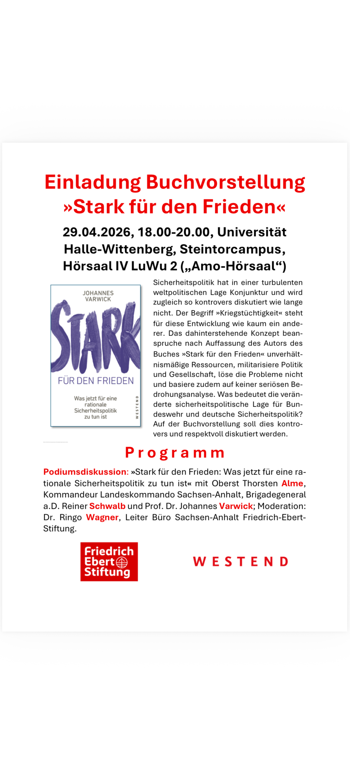 - Am 29.o4.2026, 18 Uhr wird an der Universität Halle am Steintorcampus mein Buch „Stark für den Frieden“ vorgestellt, mit spannenden Gästen. Die Veranstaltung ist öffentlich, Details und Hörsaal hier (29.04.2026)